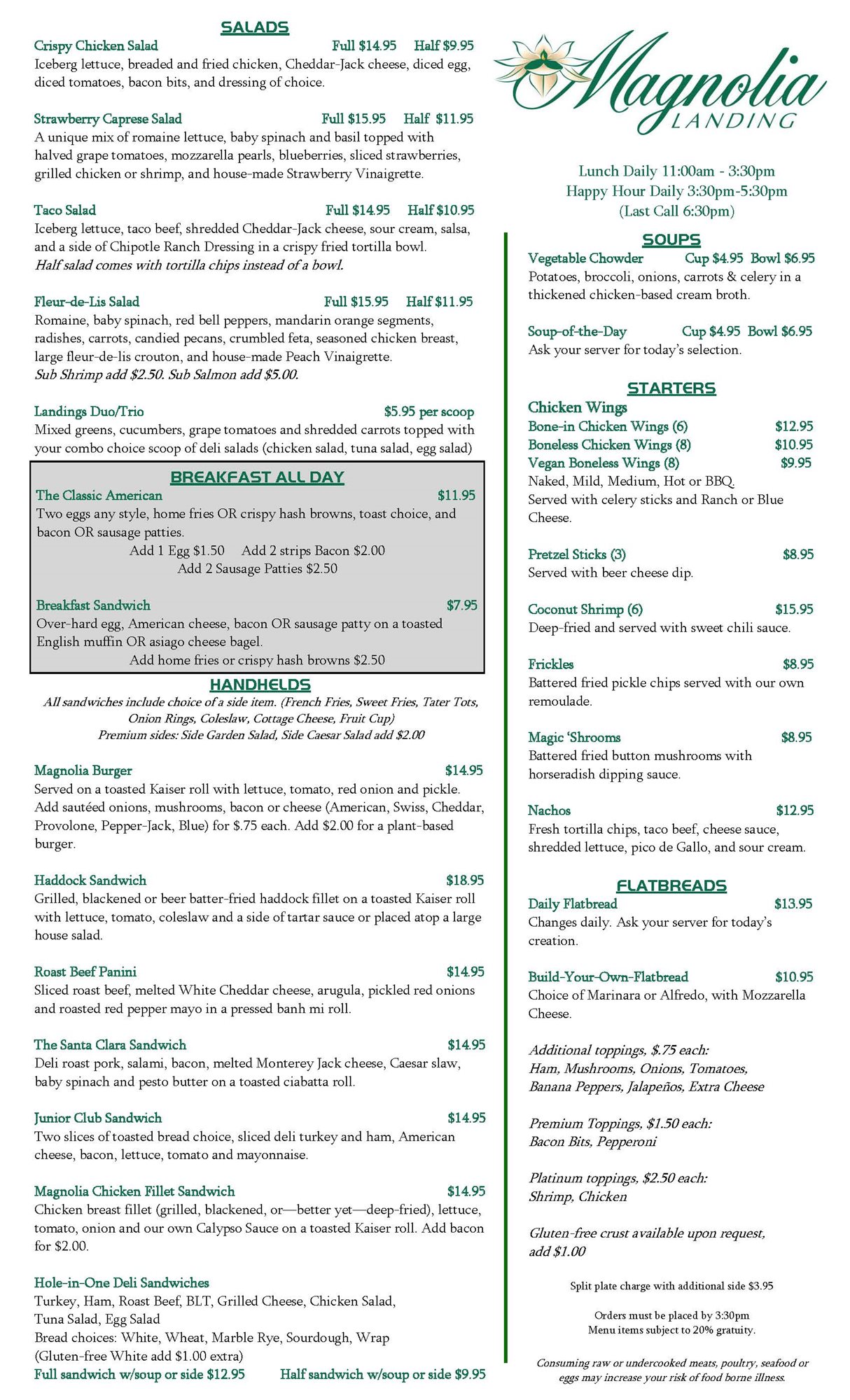 We are excited the Magnolia Landing Grille is open 7 days a week for indoor and outdoor dining (11:00 am - 3:30 pm). Takeout and delivery for lunch is available daily. Delivery is availabe when staffing permits.